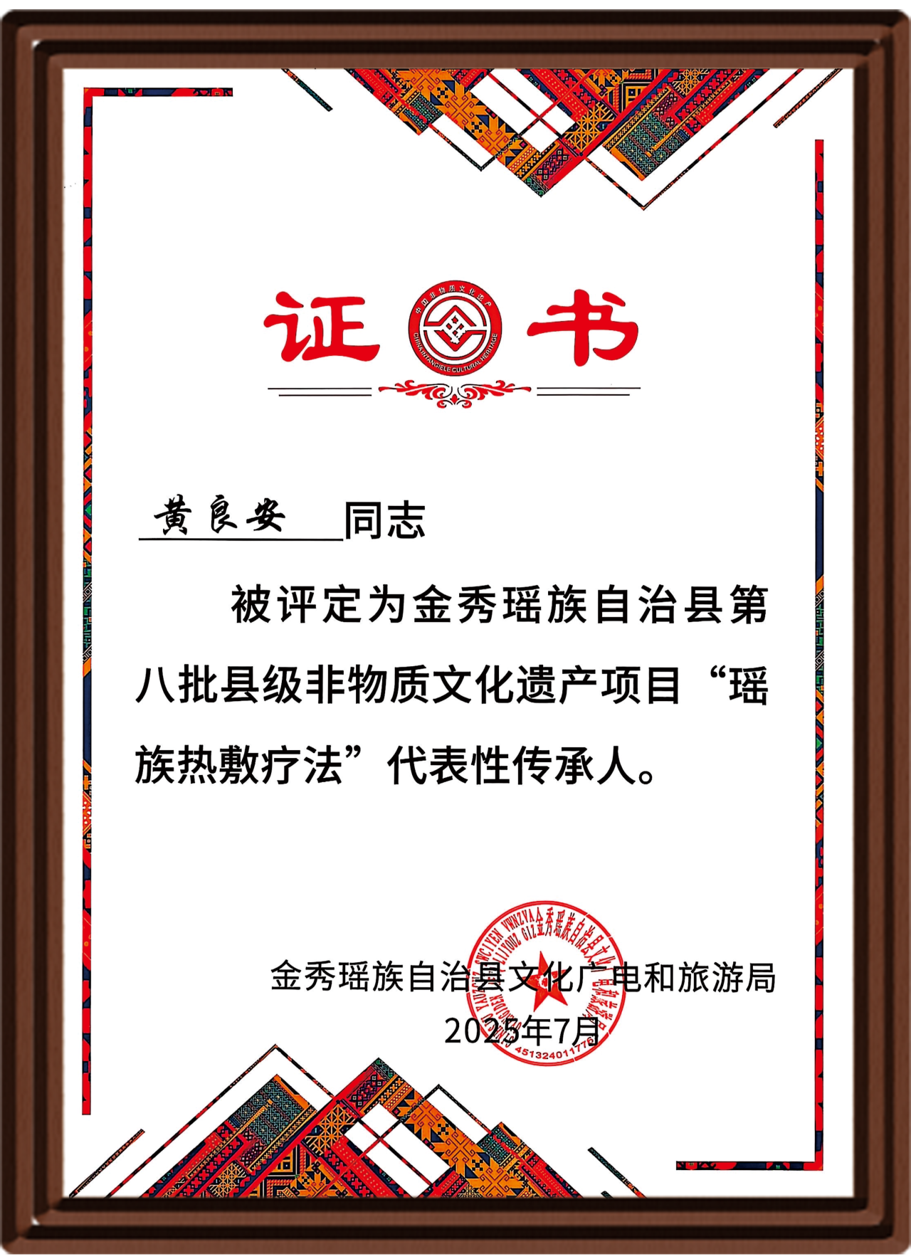 2025年6月,广西来宾瑶族自治县人民政府公示第八批县级非物质文化遗产项目代表性传承人,黄良安的名字与“瑶药热敷疗法” 紧紧绑在一起。而这只是他守护传统技艺的缩影,2024年12月,他还以第一申报人身份主导申报“瑶族药酒酿泡技艺(瑶族外用药酒酿泡技艺)”,成功将另一项瑶医技法载入县级非遗名录。