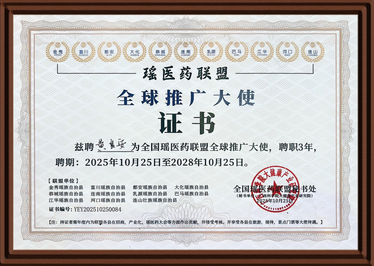 2025年10月,在瑶博会上,黄良安接过“瑶医药联盟全球推广大使”授牌,而这并非他第一份荣誉。从专业技能认证到行业权威表彰,每一份证书与称号背后,都是他与瑶医药的深度羁绊。如今,他以宏瑶集团副总裁身份扎根金秀,身兼中国民族医药学会瑶医药分会第三届理事会常务理事等多重身份,在收获荣誉后坦言:“找到‘根’的感觉,就是看到瑶药能帮到更多人,瑶医药也让家乡的发展变得越来越好。”